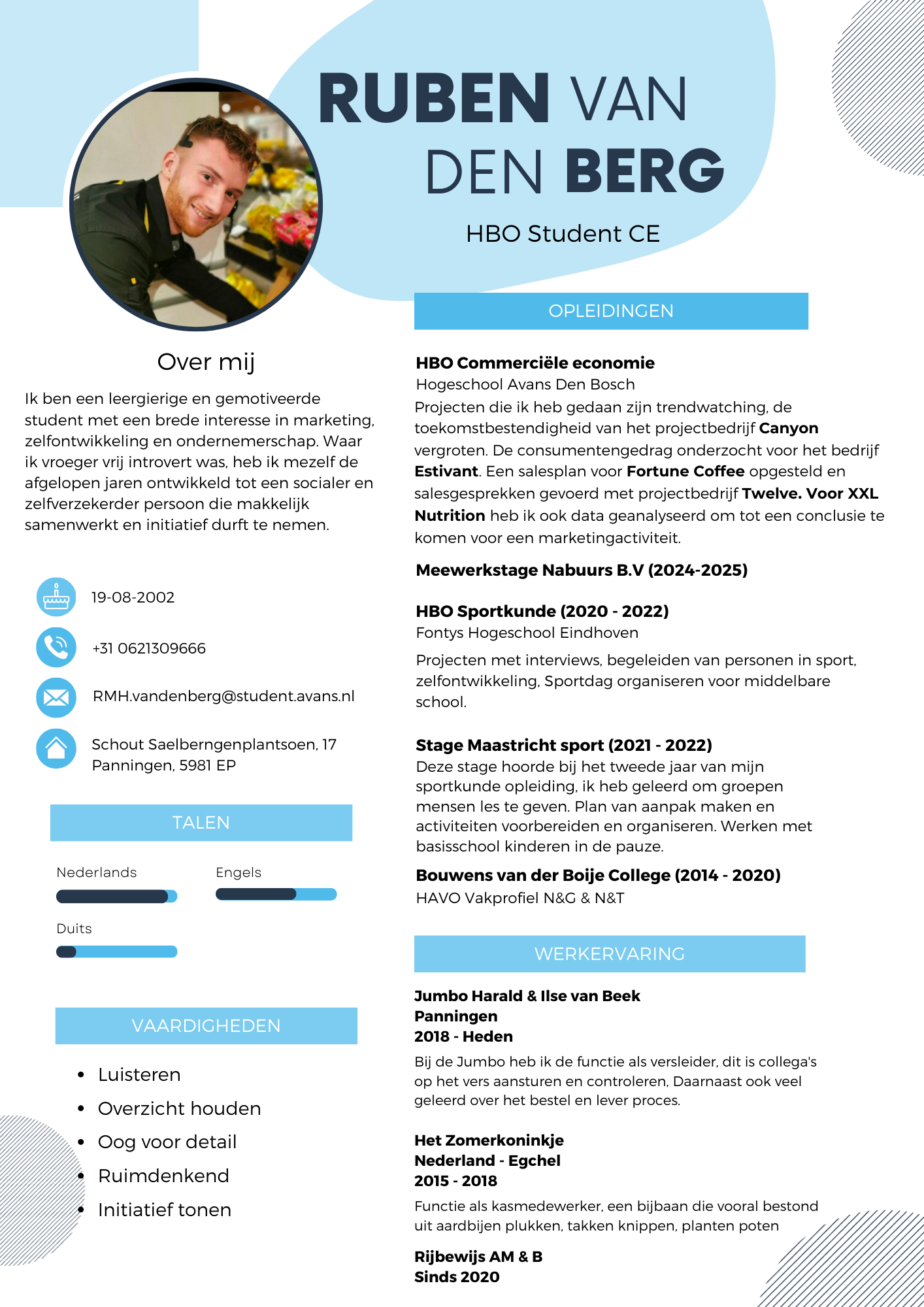 I am a curious and motivated student with a broad interest in marketing, personal development, and entrepreneurship. While I used to be quite introverted, over the past few years I’ve grown into a more social and confident person who collaborates easily and isn’t afraid to take initiative.